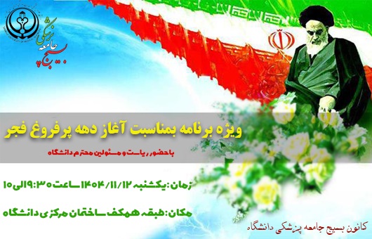 ضمن تبریک اعیاد شعبانیه و تقارن دهه مهدویت و دهه پر فروغ فجر  به استحضار می رساند به مناسبت در پیش داشتن ایام الله دهه فجر ، کانون بسیج دانشگاه در نظر دارد در خصوص سالروز ورود تاریخی امام خمینی(ره)به میهن اسلامی و نواختن زنگ انقلاب ، روز یکشنبه 12 بهمن ماه راس ساعت  9:30 صبح در لابی ساختمان مرکزی ویژه برنامه ای با حضور و ایراد سخنرانی ریاست دانشگاه برگزار نماید، لذا از تمامی کارکنان جهت حضور در برنامه دعوت به عمل می آید.