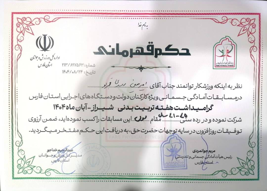 «امیر حسین اسدی»، مسئول حفاظت فیزیکی مرکز آموزشی درمانی شهید دستغیب مقام اول رده سنی 41 تا 45، مسابقات آمادگی جسمانی کارکنان دولت را کسب نمود.